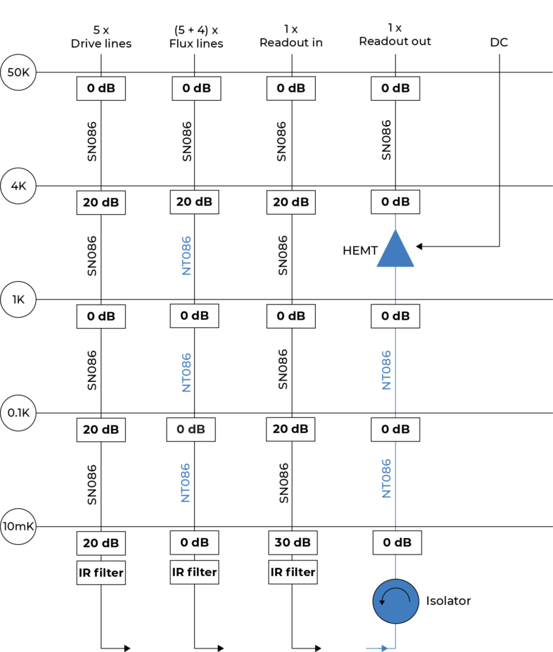 - 1 low-loss readout output line with isolator and HEMT amplifier